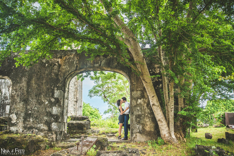 La séance photo de S&L : une ballade en amoureux dans les allées d’un beau jardin, et dans les ruines d’une ancienne bâtisse créole.
